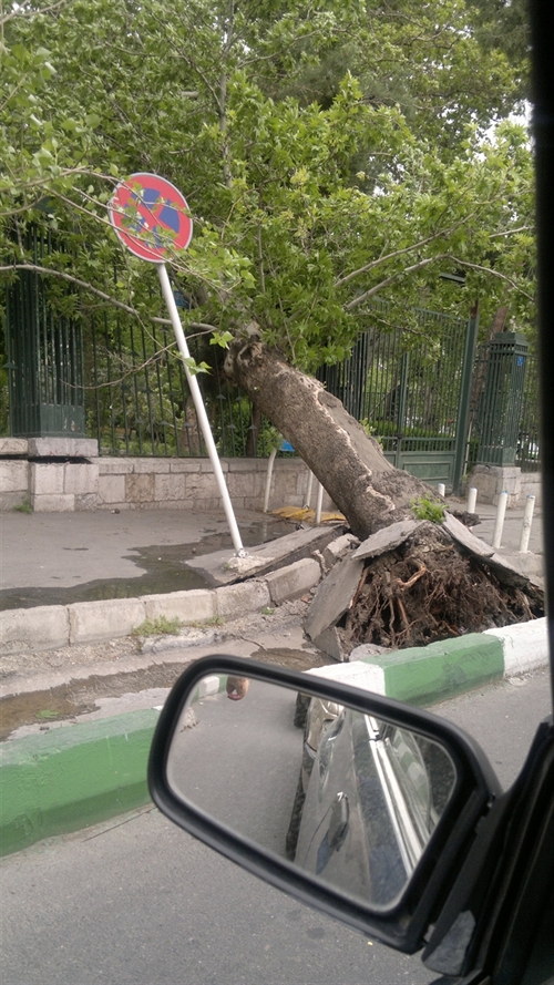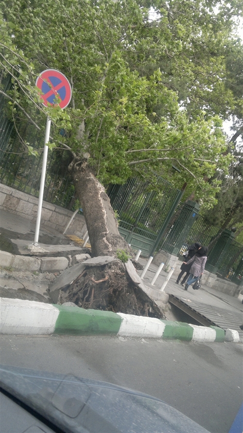 امروز عصر وقتی رسیدم به خیابون ۱۶ آذر این درخت رو که از ریشه در اومده بود دیدم ..نمی دونم یعنی باد شدید عصر امروز این درخت رو از ریشه در آورده بود یا.....به هر حال ناراحت کننده بوذ برام ..